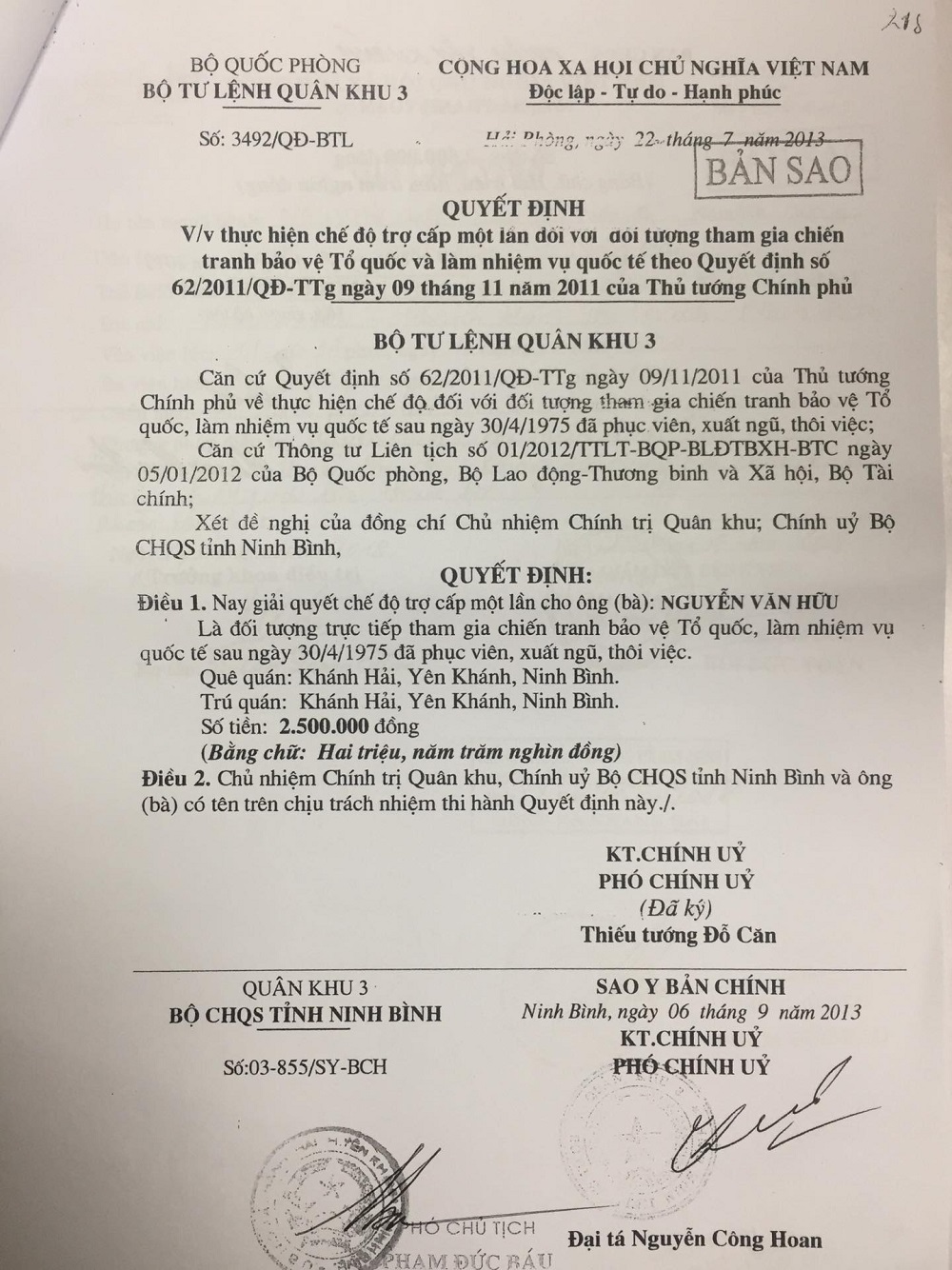 | Quyết định số 3492/QĐ-BTL ngày 22/7/2013 của Bộ Tư lệnh Quân khu 3 |