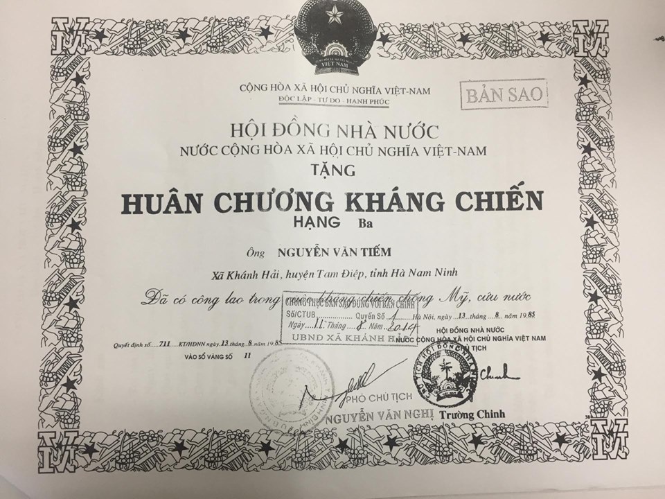 | Hội đồng Nhà nước tặng thưởng Huân chương Kháng chiến Hạng ba cho Ông Nguyễn Văn Tiếm bố đẻ Nguyễn Văn Hữu |