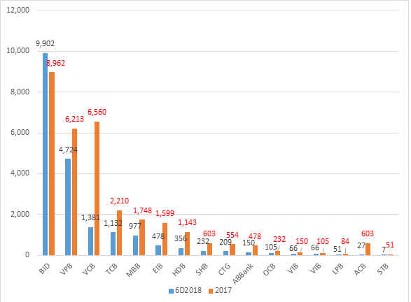 Lợi nhuận thuần trước dự phòng và chi phí trích lập dự phòng ngân hàng nửa đầu năm 2018 (Đvt: Tỷ đồng). Nguồn Vietstock |