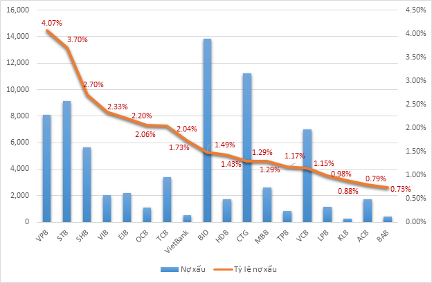 | Biểu đồ Tỷ lệ nợ xấu so với dư nợ cho vay khách hàng của các ngân hàng (Đvt: Tỷ đồng, %). Nguồn Vietstock |