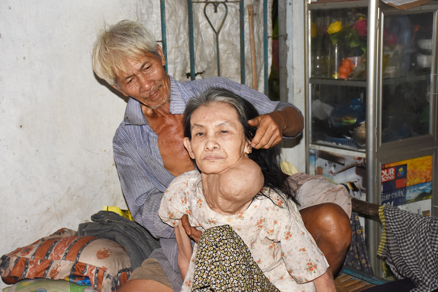 | Ông tên Nguyễn Văn Hùng đang chăm sóc người vợ bệnh tật. |