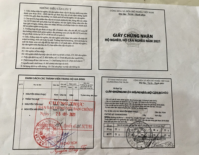 Ngôi nhà nhỏ nằm ở chân dốc, nơi sinh sống của gia đình 4 người không có bất cứ đồ vật gì giá trị: Chiếc ti vi cũ mèm được đặt ở góc nhà, chiếc ghế xin được từ nhà hàng xóm,... đồ đạc trong nhà hầu hết là đồ thừa hoặc đã cũ mà anh chị xin được. Chúng tôi đến thăm gia đình chị Trần Thị Huệ (39 tuổi, thôn Đại Tự 1, xã Đại Tự, huyện Yên Lạc, tỉnh Vĩnh Phúc).