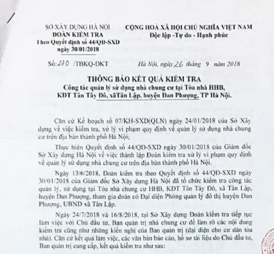 Cụ thể, tại Kết quả kiểm tra số 270/TBKQ-ĐKT ngày 26/9/2018, được thực hiện theo Quyết định số 44/QĐ-SXD ngày 30/1/2018 của Sở xây dựng Hà Nội về việc: “Thông báo kết quả kiểm tra Công tác quản lý và sử dụng nhà chung cư tại Tòa HHB, KĐT Tân Tây Đô, xã Tân Lập, huyện Đan Phượng, TP Hà Nội.