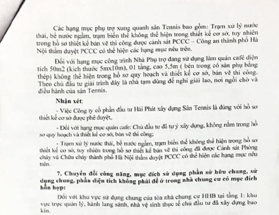 Nhận xét về những công trình này, Kết quả kiểm tra nêu rõ, hạng mục quán cafe, Chủ đầu tư đã đã tự ý xây dựng, không nằm trong hồ sơ quy hoạch và thiết kế cơ sở, bản vẽ thi công. Trạm xử lý nước thải, bể nước ngầm, trạm biến thế cũng không nằm trong hồ sơ, thiết kế cơ sở, tuy nhiên trong hồ sơ thiết kế thi công được cảnh sát PCCC – Công an TP Hà Nội thẩm duyệt PCCC có thể hiện hạng mục nêu trên.
