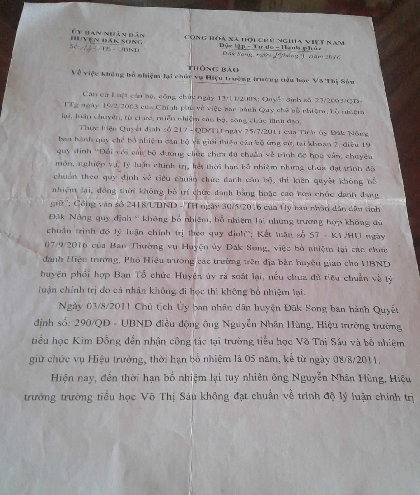 | Thông báo về việc không bổ nhiệm lại chức vụ Hiệu trưởng Trường tiểu học Võ Thị Sáu của UBND huyện Đắk Song. |
