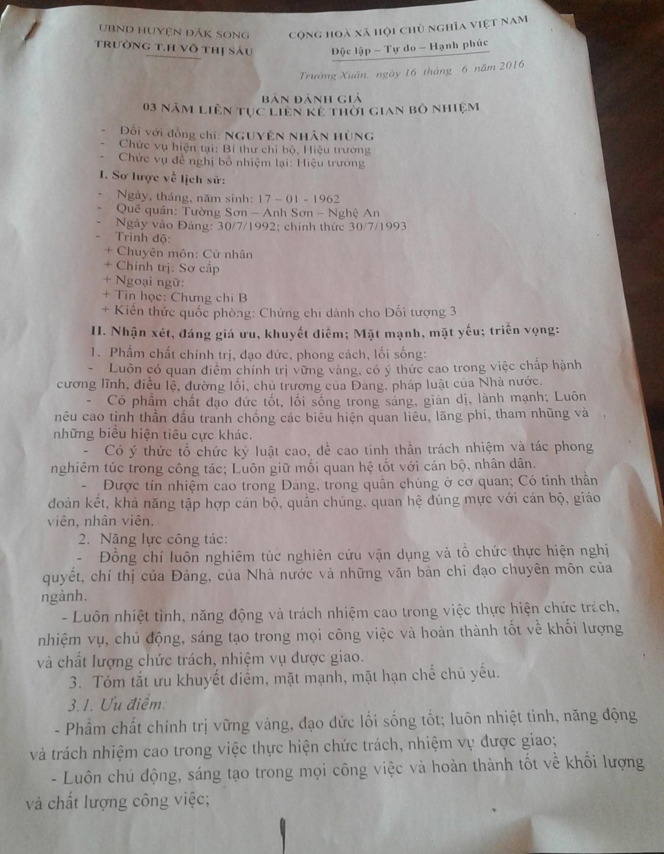 Sau khi Tôi nhận được Thông báo thì BGH Nhà trường, Trường tiểu học Võ Thị Sáu, có tờ trình nhận xét gửi UBND huyện Đắk Song và Lãnh đạo PGDDT huyện Đắk Song ngày 10/6/2016 nêu rõ quá trình công tác với vai trò là hiệu trưởng Ông Nguyễn Nhân Hùng luôn nêu cao vai trò trách nhiệm được tập thể BGH và giáo viên Nhà trường, phụ huynh và học sinh tin yêu, kính trọng!