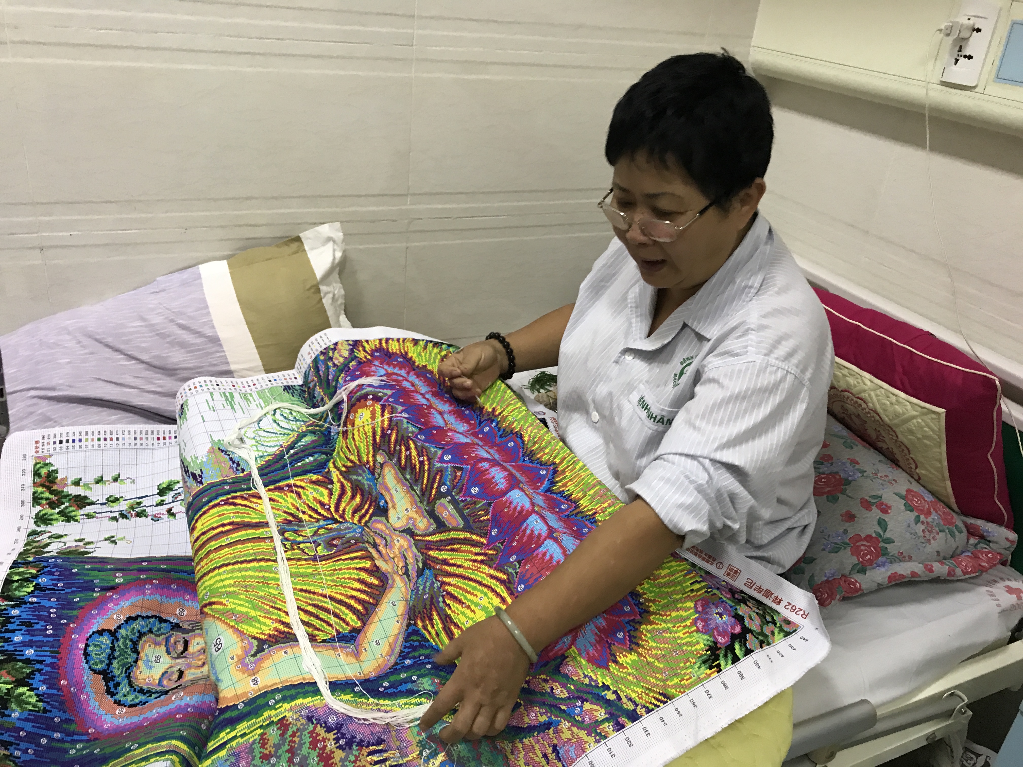 Khi tìm tới tầng 10, trung tâm Y học Hạt nhân và Ung bướu (bệnh viện Bạch Mai), nơi bà Trần Thị Thanh Hương đang nằm điều trị căn bệnh ung thư vú giai đoạn cuối, chúng tôi thấy bà đang nắn nót từng mũi thêu trên bức vẽ Phật Adida.