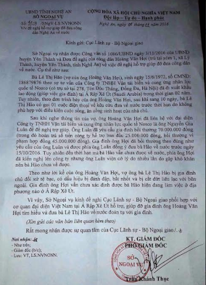 | Công văn của Sở Ngoại vụ Nghệ An gửi Cục Lãnh sự Bộ Ngoại giao đề nghị can thiệp đưa bà Lê Thị Hảo về nước |