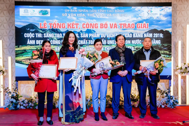 Giám đốc Sở Văn hóa, Thể thao và Du lịch Sầm Việt An trao giải nhất cho tác giả NTK Vũ Thảo Giang đoạt giải Cuộc thi “Sáng tạo ý tưởng, sản phẩm du lịch tỉnh Cao Bằng năm 2019”.