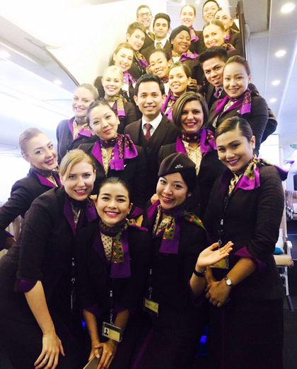 | Diệu Thúy (ở giữa, hàng đầu tiên) với các đồng nghiệp ở hãng hàng không của UAE. Ảnh: NVCC. |