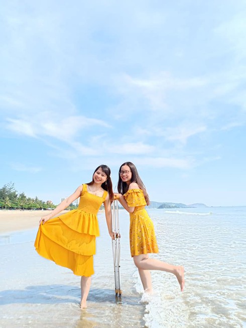 | Thu vui vẻ bên người bạn của mình trong một lần đi biển. |