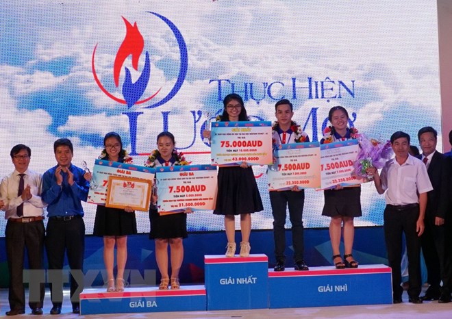 | Ban tổ chức trao giải thưởng và chúc mừng các thí sinh đoạt giải cuộc thi. (Ảnh: Thu Hoài/TTXVN) |
