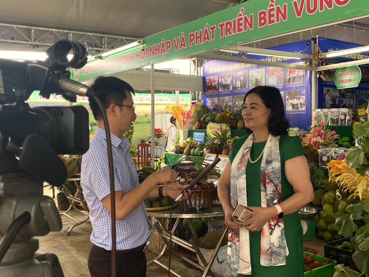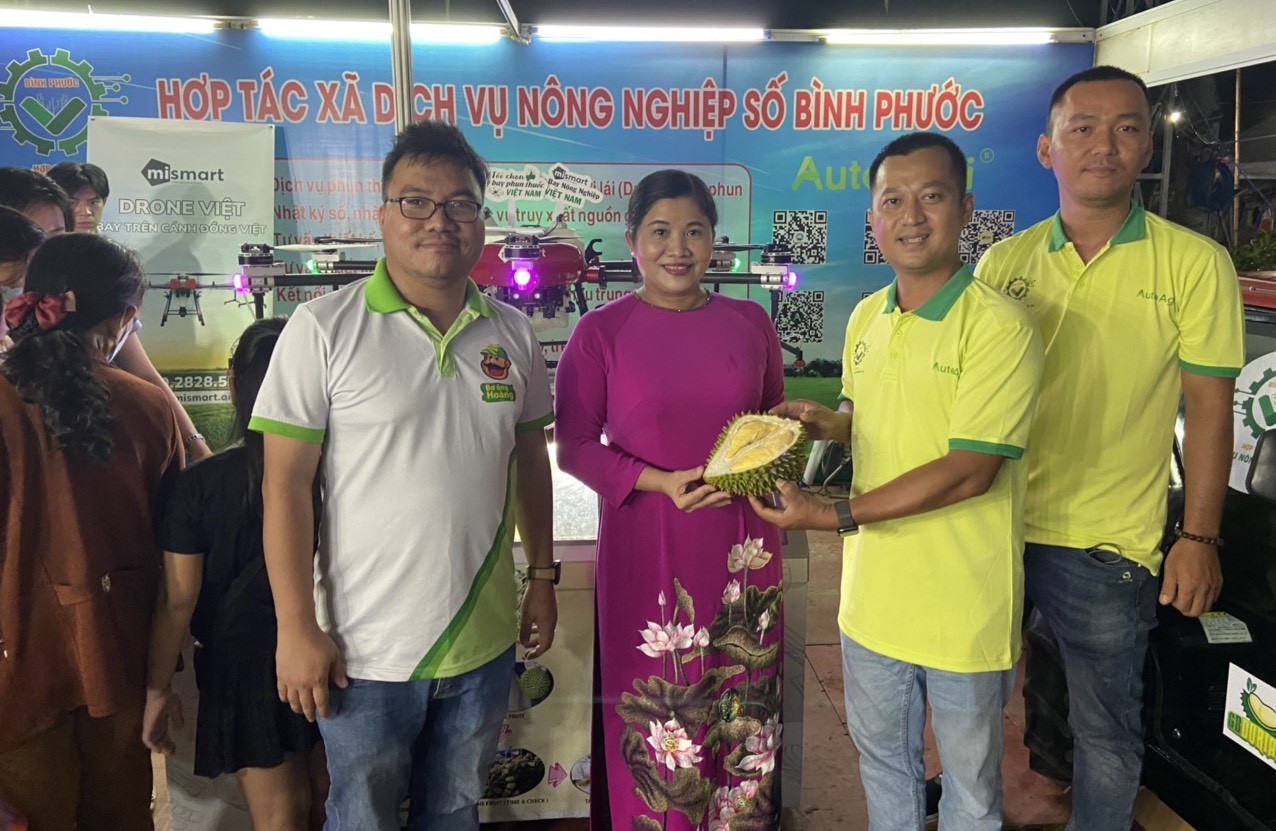 Nữ doanh nhân Nguyễn Thị Thành Thực (chính giữa) tham gia hoạt động trưng bày của HTX Dịch vụ nông nghiệp số Bình Phước.