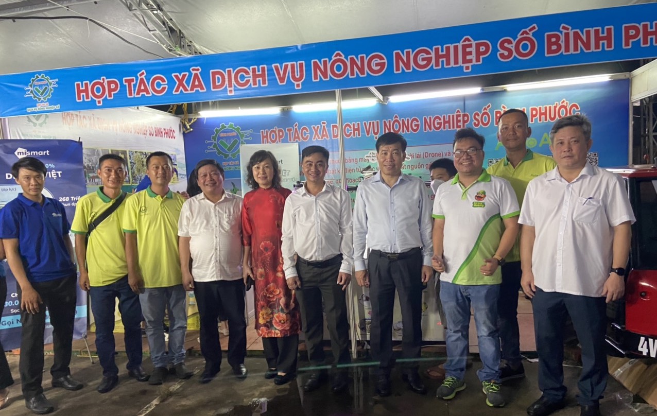 Ủy viên Trung ương Đảng, Bí thư Tỉnh ủy Bình Phước Nguyễn Mạnh Cường (thứ 7, trái sang) thăm gian hàng triển lãm của HTX Dịch vụ nông nghiệp số Bình Phước.