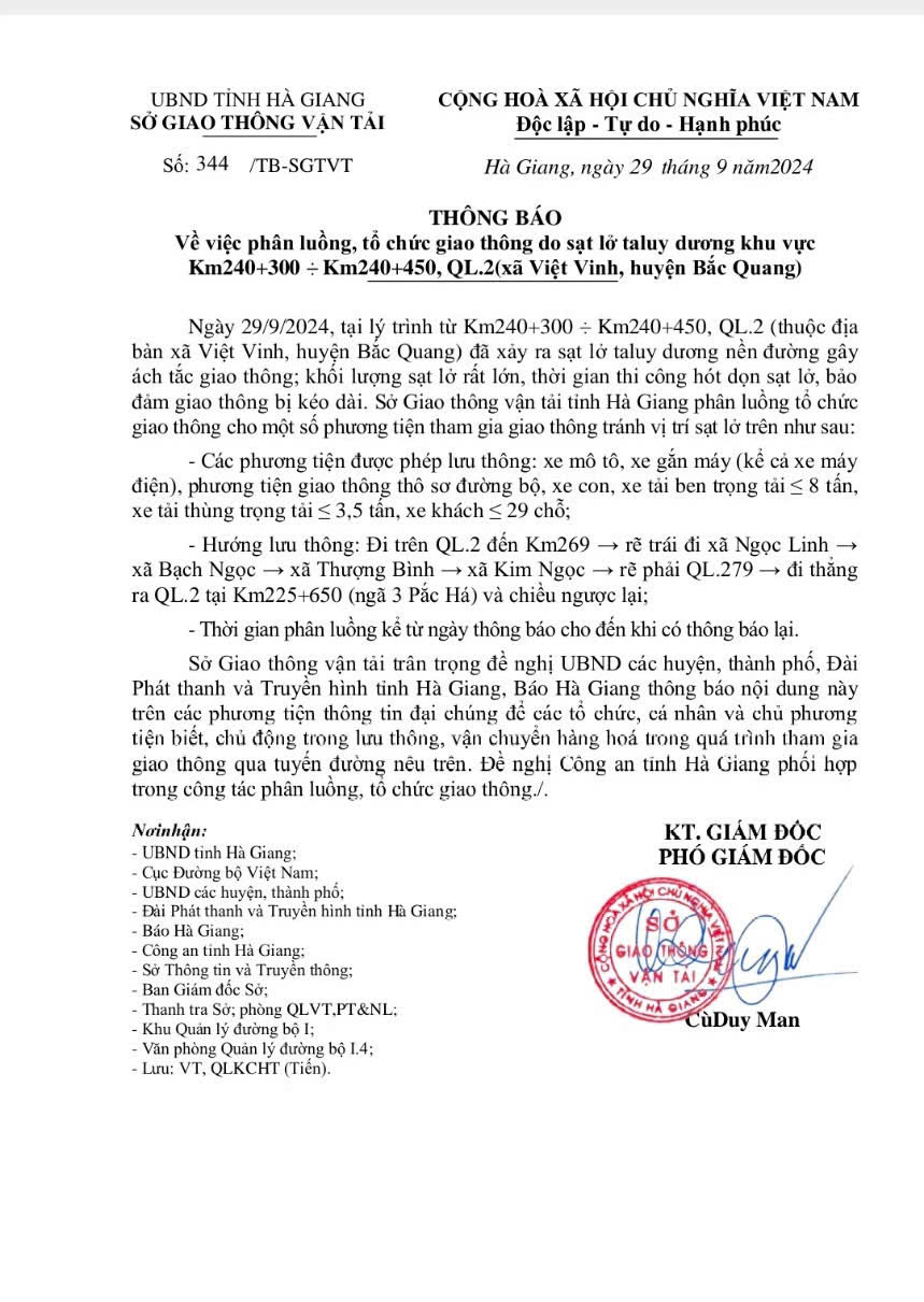 Sở GTVT tỉnh Hà Giang thông tin, tại lý trình từ Km240+300 Km240+450, QL2 thuộc địa bàn xã Việt Vinh, huyện Bắc Quang đã xảy ra sạt lở taluy dương nền đường gây ách tắc giao thông; khối lượng sạt lở rất lớn, thời gian thi công hót dọn sạt lở, bảo đảm giao thông bị kéo dài. Theo đó, các phương tiện được phép lưu thông: xe mô tô, xe gắn máy (kể cả xe máy điện), phương tiện giao thông thô sơ đường bộ, xe con, xe tải ben trọng tải ≤ 8 tấn, xe tải thùng trọng tải ≤ 3,5 tấn, xe khách ≤ 29 chỗ; Hướng lưu thông: Đi trên QL2 đến Km269 → rẽ trái đi xã Ngọc Linh → xã Bạch Ngọc - xã Thượng Bình - xã Kim Ngọc rẽ phải QL279 - đi thẳng ra QL2 tại Km225+650 (ngã 3 Pắc Há) và chiều ngược lại.