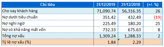 Tính đến 31/12/2019, dư nợ cho vay khách hàng của OCB tăng 26% so với cùng kỳ năm trước, đồng thời nợ xấu chỉ suýt soát cùng kỳ ghi nhận 1,309 tỷ đồng. Cụ thể, nợ dưới tiêu chuẩn (nhóm 3) giảm 19% và nợ nghi ngờ (nhóm 4) tăng 25%. Do đó, tỷ lệ nợ xấu trên dư nợ cho vay của OCB giảm về mức 1.84% so với mức 2.29% hồi đầu năm.