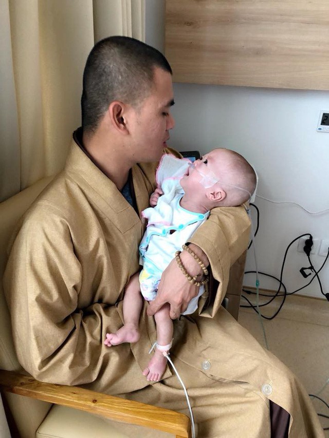 | Sư thầy Thích Tuệ Thành và một bé mắc bệnh trọng. Ảnh N.V.N |