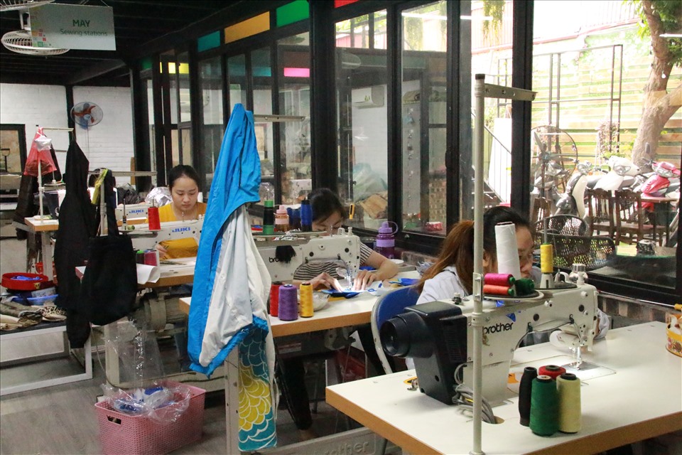 Xưởng may tất bật với âm thanh của tiếng kéo cắt vải, tiếng máy may. Ảnh: Kim Anh