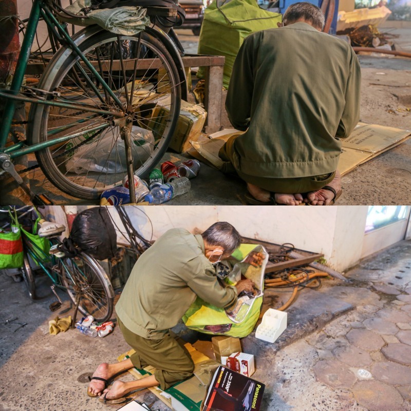 Tại Hà Nội, ông cụ tật nguyền bắt đầu công việc bới rác, địa điểm quen thuộc là ngõ 155 Cầu Giấy. Hàng ngày, ông dành 16 tiếng mưu sinh, đi hết từ quận Đống Đa, sang quận Ba Đình rồi quận Cầu Giấy trên chiếc xe đạp cũ có tuổi đời xấp xỉ 40 năm. Công việc này cho ông đồng lương ít ỏi, ngày thì 40.000 - 50.000 đồng, hôm thì 70.000 - 80.000 đồng, chỉ đủ cơm cháo qua ngày.