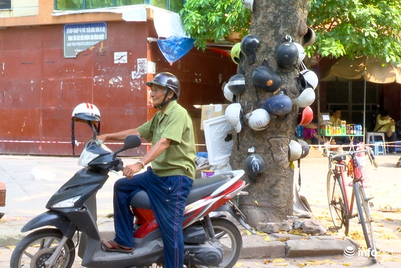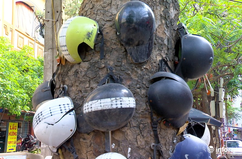 | Gốc cây xà cừ già được ông Địch treo lủng lẳng các loại mũ bảo hiểm đã bị hỏng. |