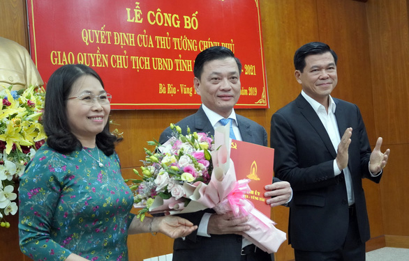 | Ông Nguyễn Thành Long (giữa) nhận quyết định và hoa chúc mừng từ ông Nguyễn Hồng Lĩnh - bí thư Tỉnh ủy Bà Rịa - Vũng Tàu và bà Nguyễn Thị Yến - phó bí thư thường trực Tỉnh ủy Bà Rịa - Vũng Tàu - Ảnh: Đ.H. |