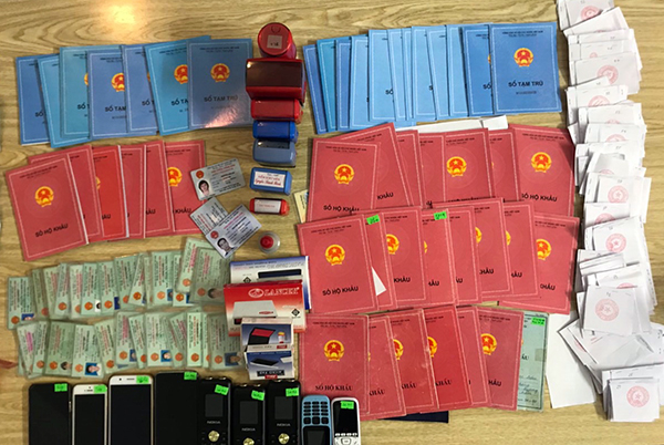 Nhiều phôi sổ tạm trú, sổ hộ khẩu và nhiều mẫu dấu khác nhau được thu tại nhà đối tượng Trịnh XuânThắng. Ảnh: Báo CAND