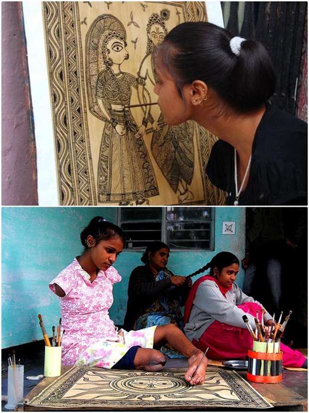 Sarita Dwivedi, 24 tuổi, ở huyện Fatehpur, bang Uttar Pradesh, Ấn Độ. Năm 4 tuổi, Sarita không may bị mất đi đôi tay và chân phải trong một vụ tai nạn, thế nhưng, điều đó không hề ảnh hưởng đến niềm đam mê hội họa của cô gái trẻ. Sarita đã cho mọi người thấy bản thân là một người "tàn nhưng không phế", cô đã nỗ lực dùng bàn chân và hàm răng của mình để vẽ nên những tác phẩm tuyệt đẹp.