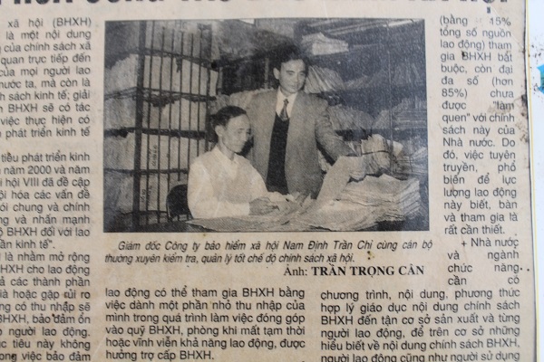 Ảnh ông Trần Văn Hiểu (người ngồi bên trái) khi đang là cán bộ quản lý hồ sơ BHXH tỉnh (đăng trên báo Nhân Dân số ra ngày 18/4/1997) cùng ông Trần Chỉ, Giám đốc BHXH tỉnh Nam Định.