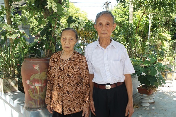 Thương binh Trần Văn Hiểu cùng vợ là bà Nguyễn Thị Cổn chụp ảnh lưu niệm tại vườn nhà.