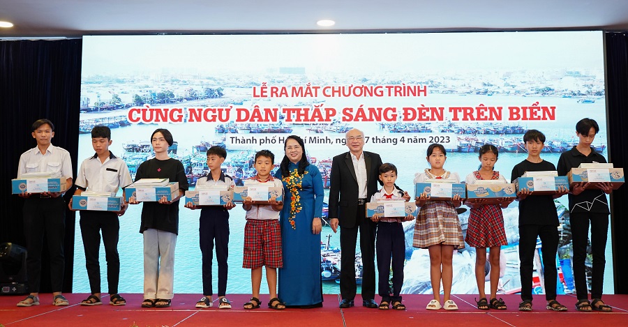 Ông Phan Nguyễn Như Khuê - Trưởng Ban Tuyên giáo Thành ủy và bà Trần Kim Yến - Chủ tịch UBMTTQVN TP Hồ Chí Minh trao quà, học bổng cho các em học sinh ở các gia đình bà con ngư dân gặp khó khăn.