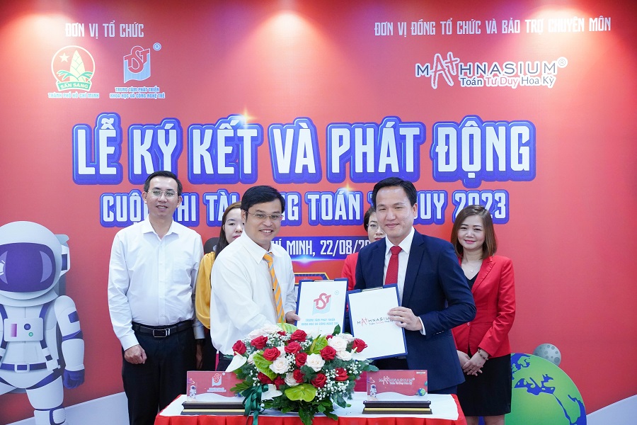 Đại diện Trung tâm Phát triển Khoa học và Công nghệ trẻ TP Hồ Chí Minh và Hệ thống Toán tư duy Hoa Kỳ Mathnasium Việt Nam ký kết biên bản ghi nhớ về việc tổ chức cuộc thi.