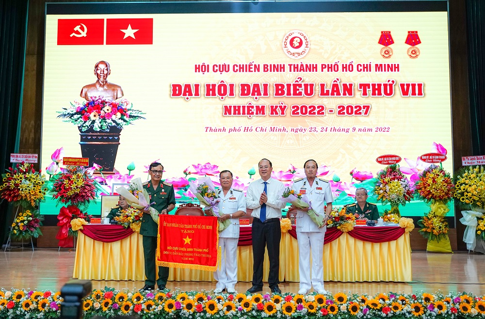Đồng chí Nguyễn Hồ Hải - Phó Bí thư Thành ủy Thành phố Hồ Chí Minh thay mặt lãnh đạo UBND Thành phố trang tặng cờ Thi đua khen thưởng năm 2021 đến Tập thể Hội Cựu chiến binh Thành phố.