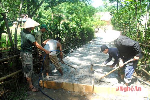 Tại bản Na Biêng, người dân đã hiến 500m2 đất, tham gia 140 ngày công và đóng góp 32 triệu đồng để mua cát, đá, sỏi, hoàn thành 180m đường giao thông nông thôn.