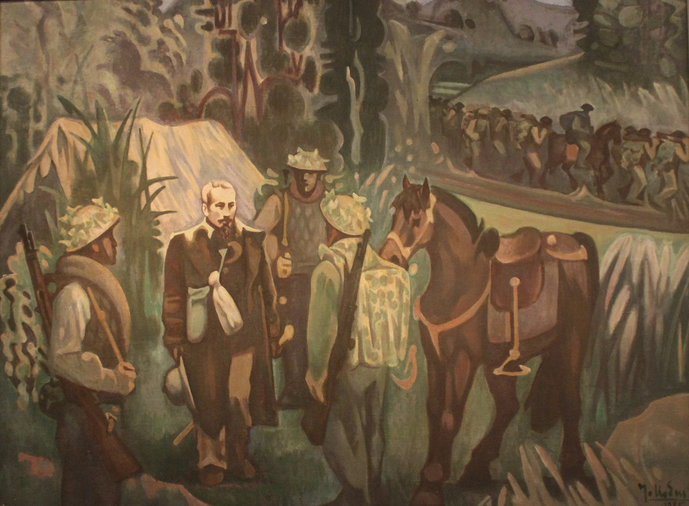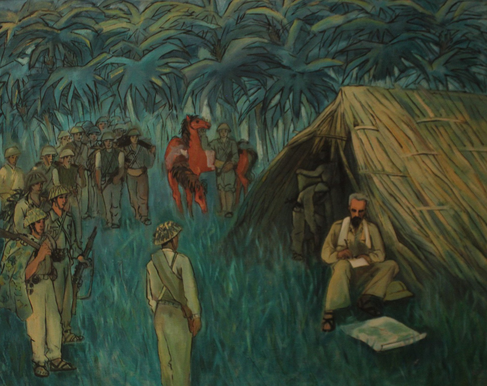 | Tác phẩm sơn dầu "Rời lều có Bác tiếp tục hành quân" của Nguyễn Trọng Kiệm sáng tác năm 1985 |