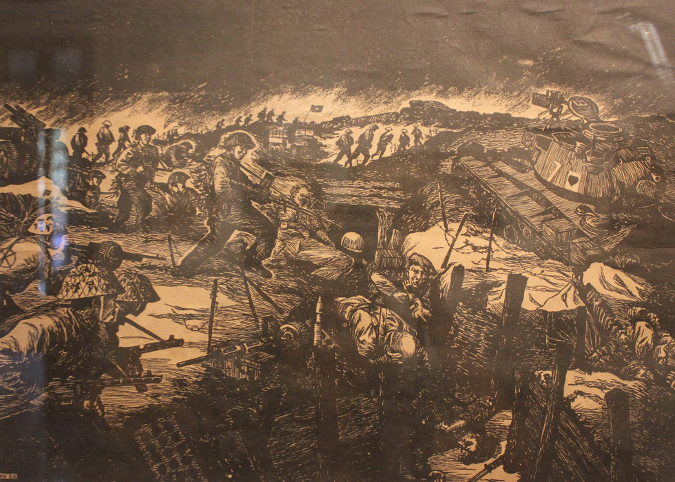 | Tác phẩm khắc gỗ "Trung tâm Điện Biên Phủ" của Huy Toàn sáng tác năm 1958 |