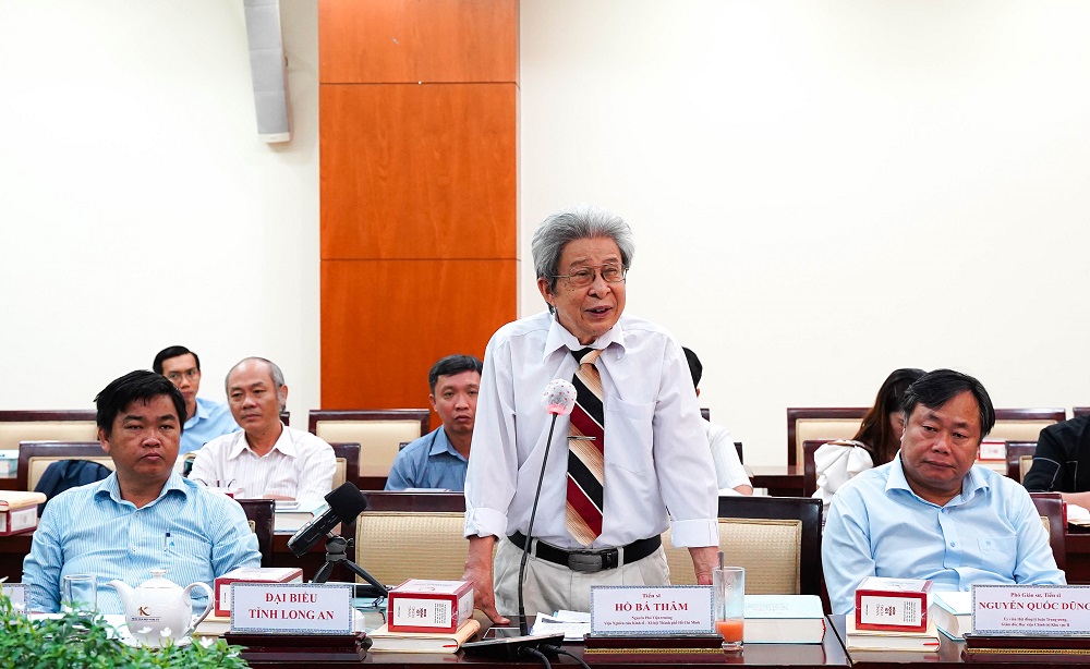 Tiến sĩ Hồ Bá Thâm - Phó chủ tịch Hội Khoa học phát triển nguồn nhân lực và nhân tài TP Hồ Chí Minh, trình bày tham luận từ điểm cầu TP Hồ Chí Minh.