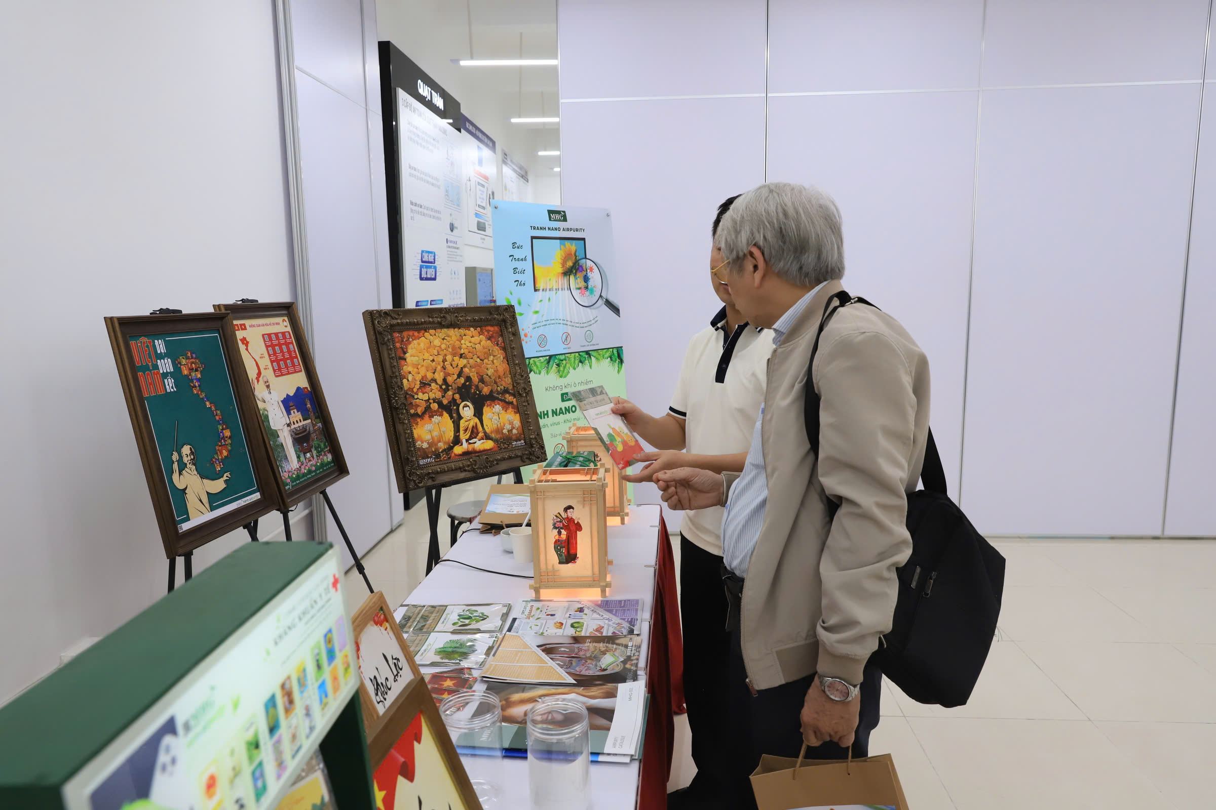 Đại biểu tham qua sản phẩm tranh in từ nguyên liệu Nano Airpurity