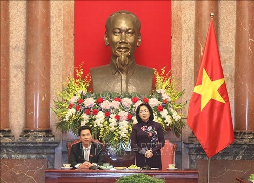 | Phó Chủ tịch nước Đặng Thị Ngọc Thịnh phát biểu tại buổi gặp mặt. Ảnh: TTXVN |