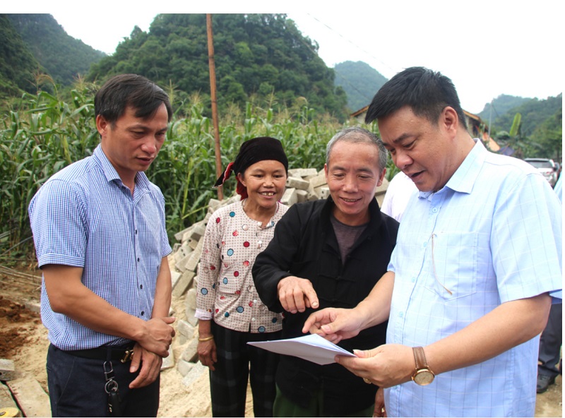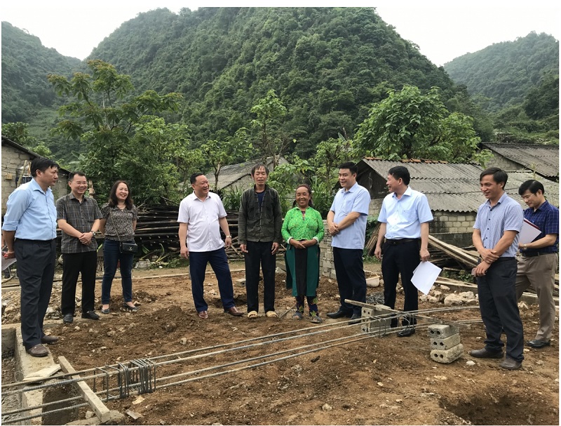 Phó Chủ tịch TT UBND tỉnh Hoàng Gia Long kiểm tra thực tế tiến độ các hộ đang làm nhà. (Ảnh: Nguồn Đài PT&TH Hà Giang)