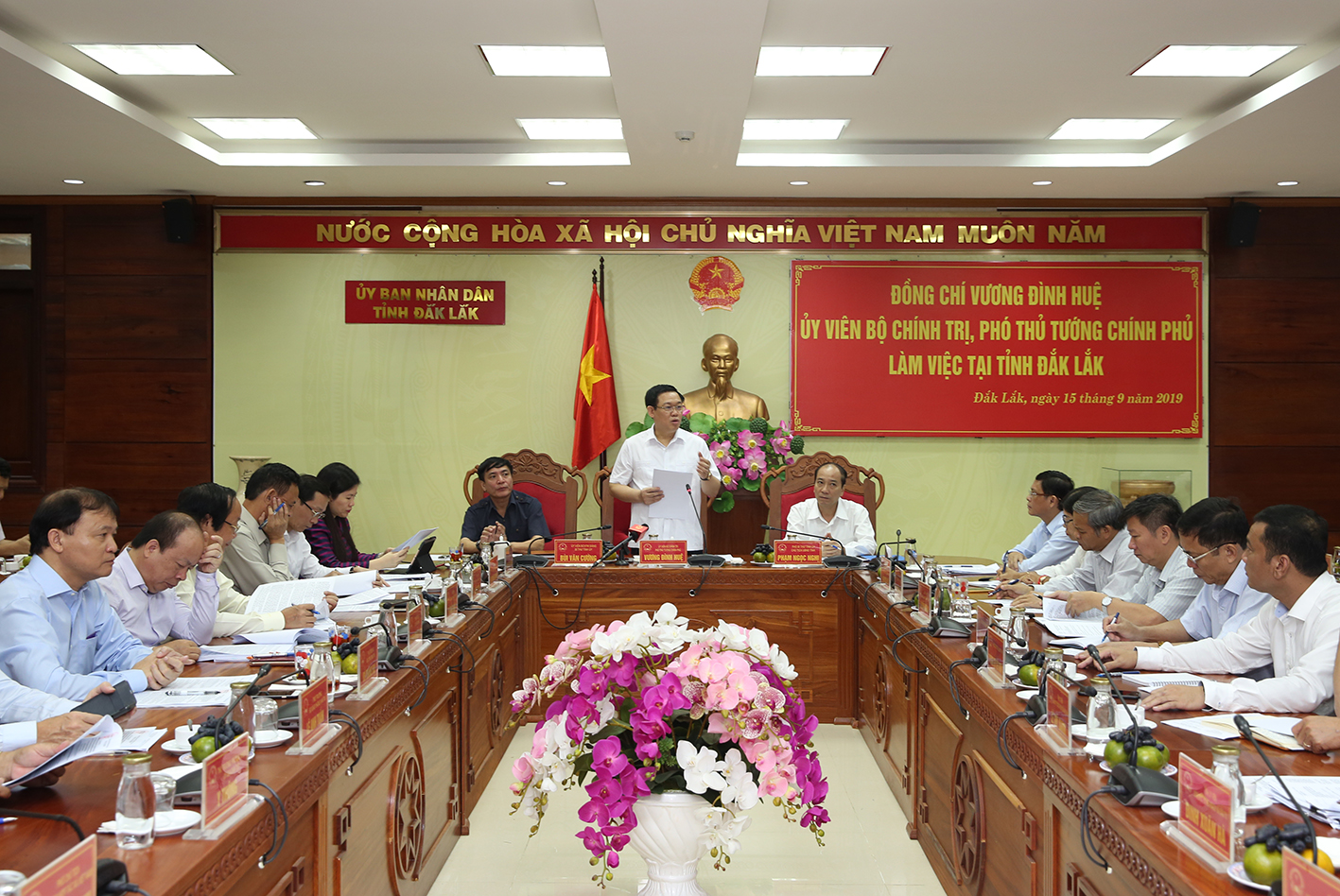 Sáng 15/9, tại thành phố Buôn Ma Thuật, Phó Thủ tướng Vương Đình Huệ và lãnh đạo các bộ, ngành Trung ương đã làm việc với lãnh đạo tỉnh Đắk Lắk về tình hình phát triển kinh tế, xã hội và thực hiện các Nghị quyết của Trung ương và Chính phủ về xây dựng nông thôn mới, kinh tế tập thể và sắp xếp, đổi mới, phát triển các nông lâm trường.