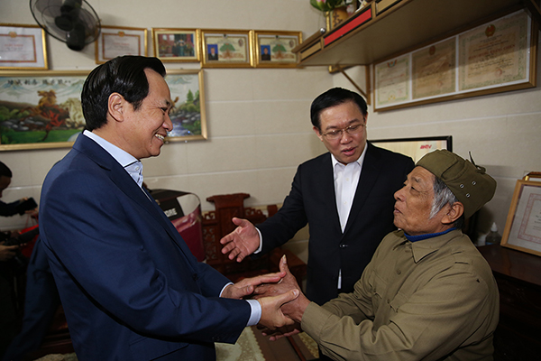 Phó Thủ tướng Vương Đình Huệ thăm hỏi thương binh Đào Đức Toàn. Ảnh: VGP/Thành Chung