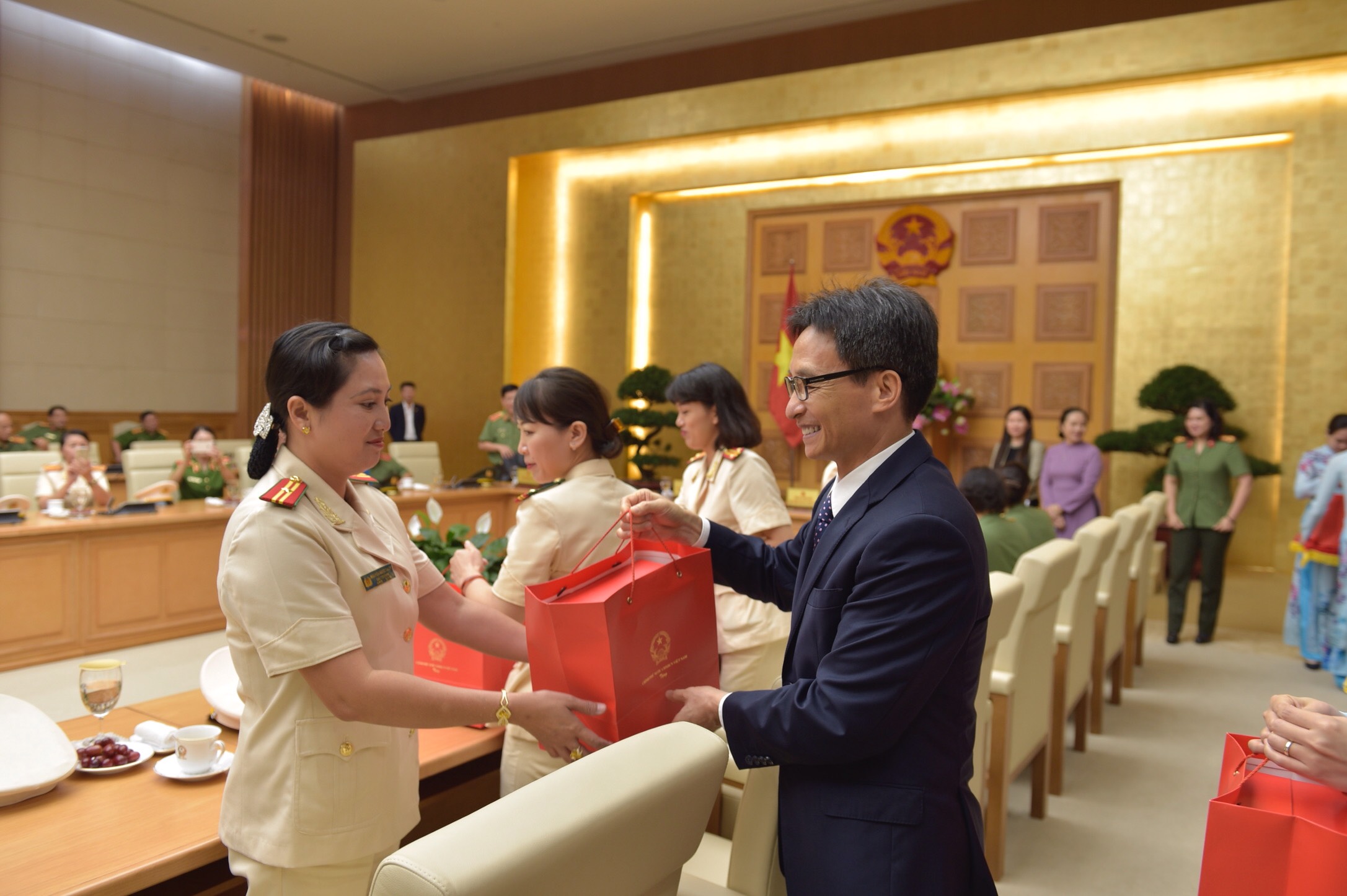 | Phó Thủ tướng tặng quà cho các nữ cán bộ, chiến sĩ Công an nhân dân tiêu biểu. Ảnh VGP/Nhật Bắc |