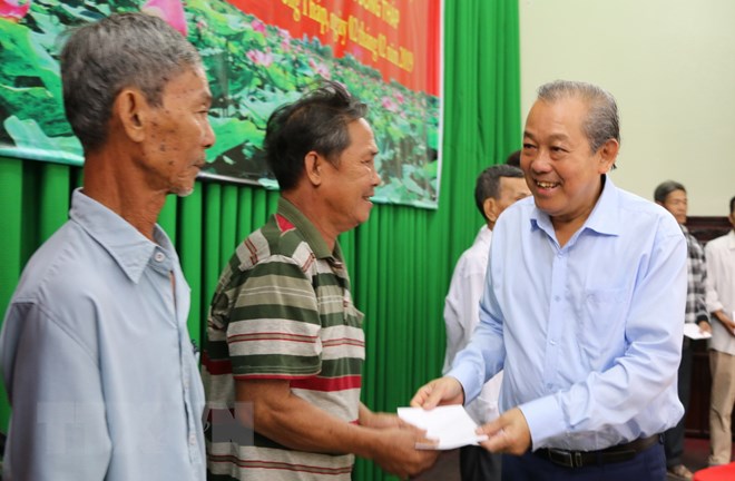 | Phó Thủ tướng Trương Hòa Bình tặng quà cho các gia đình hộ nghèo hai huyện Tháp Mười và Cao Lãnh, tỉnh Đồng Tháp. (Ảnh: Chương Đài/TTXVN) |
