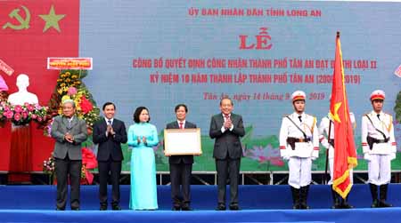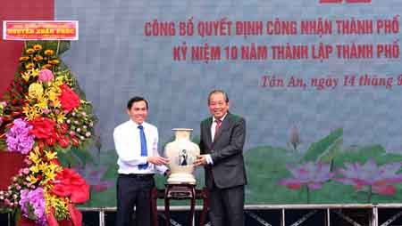 | Phó Thủ tướng Thường trực Trương Hòa Bình trao quyết định của Thủ tướng Chính phủ công nhận thành phố Tân An là đô thị loại II. Ảnh: VGP/Lê Sơn |