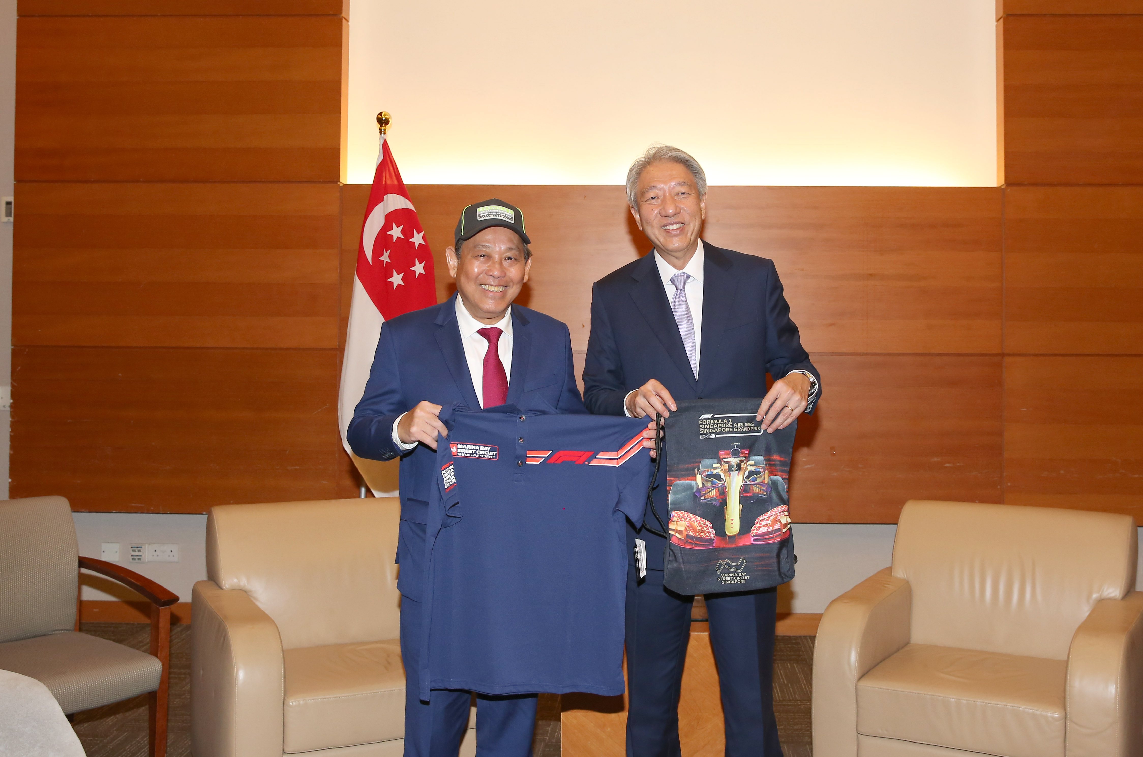 | Bộ trưởng Cao cấp điều phối an ninh quốc gia Singapore Trương Chí Hiền tặng Phó Thủ tướng Thường trực Trương Hòa Bình áo thi đấu Vòng đua Công thức 1 tại Singapore - Ảnh: VGP/Lê Sơn |