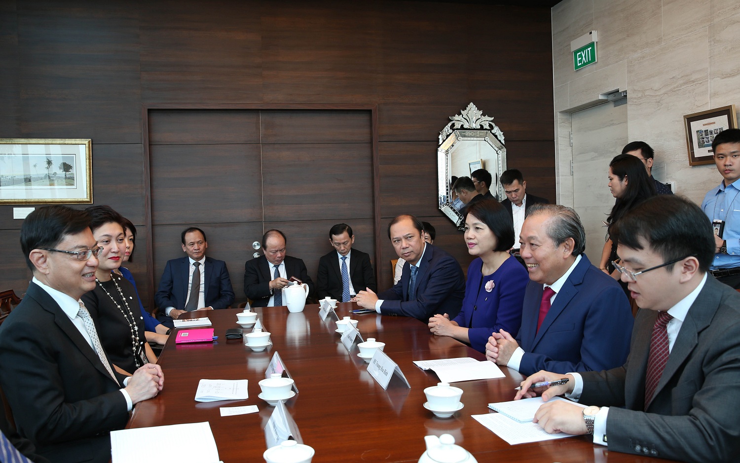 Phó Thủ tướng Thường trực Trương Hòa Bình nhấn mạnh, trong bối cảnh xu thế bảo hộ và cọ xát thương mại giữa các nước lớn gia tăng, hai nước cần tiếp tục tăng cường kết nối và phát huy hiệu quả hơn nữa tính bổ sung lẫn nhau giữa hai nền kinh tế, hoan nghênh doanh nghiệp Singapore tham gia cổ phần hóa doanh nghiệp Nhà nước của Việt Nam và tiếp tục mở rộng đầu tư, hợp tác trong các lĩnh vực phát triển hạ tầng, logisitics, tài chính, ngân hàng, công nghiệp hỗ trợ, thúc đẩy khởi nghiệp sáng tạo...