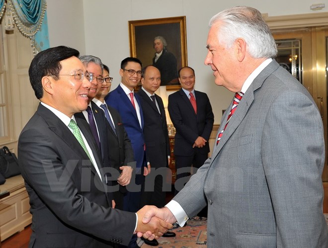 Tại cuộc hội đàm với Ngoại trưởng Tillerson và Cố vấn Hội đồng An ninh Quốc gia H.R McMaster, Phó Thủ tướng, Bộ trưởng Bộ Ngoại giao Phạm Bình Minh khẳng định chính sách nhất quán của Việt Nam triển khai đường lối đối ngoại độc lập, tự chủ, đa phương hóa, đa dạng hóa, tích cực hội nhập quốc tế; coi trọng và sẵn sàng làm việc với chính quyền mới của Hoa Kỳ nhằm củng cố và làm sâu sắc hơn quan hệ Đối tác toàn diện vững mạnh, ổn định, lâu dài, xây dựng và cùng có lợi, trên cơ sở tôn trọng độc lập, chủ quyền, thể chế chính trị, vì lợi ích của hai nước, góp phần duy trì hòa bình, ổn định, hợp tác và phát triển của khu vực Châu Á-Thái Bình Dương và trên thế giới.