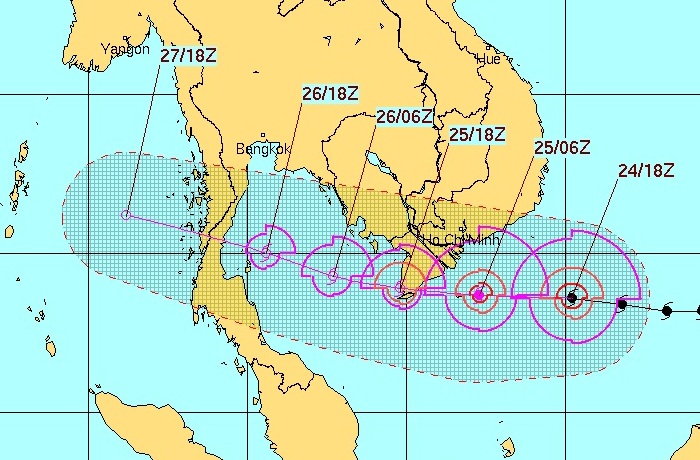 Dự báo trong 24 giờ tới, bão di chuyển chủ yếu theo hướng Tây, tốc độ di chuyển nhanh (25km/h), khoảng tối và đêm nay (25/12) bão sẽ đi vào đất liền các tỉnh từ Bà Rịa - Vũng Tàu đến Cà Mau với sức gió mạnh nhất cấp 9-10, giật cấp 12-13.