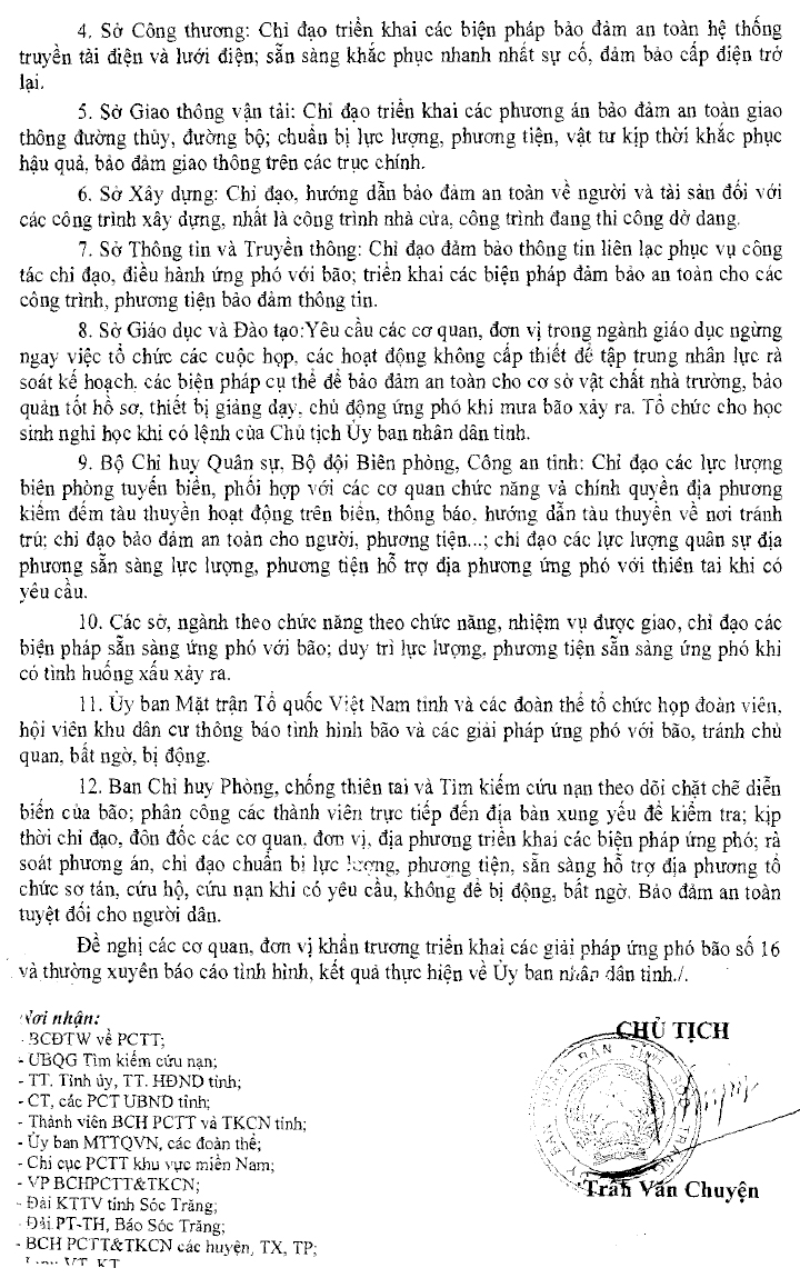 Theo Chủ tịch UBND tỉnh Sóc Trăng Trần Văn Chuyện, đối với các điểm xung yếu, tỉnh đã chỉ đạo quyết liệt công tác ứng phó với bão số 16 (Tembin). Hiện nay, công tác sẵn sàng ứng cứu phải được coi là nhiệm vụ số một của các lực lượng chức năng.