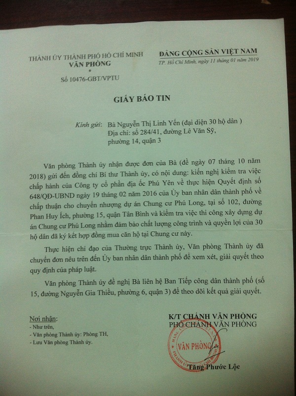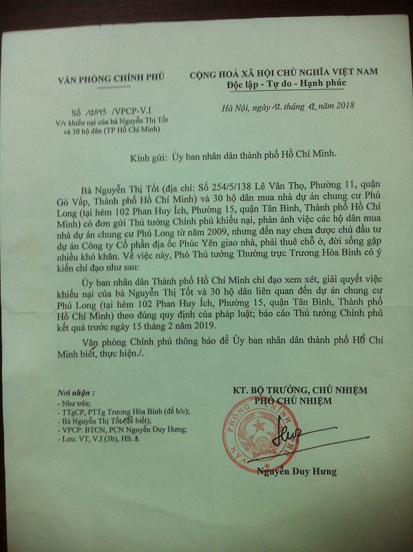Các hộ dân đã gửi nhiều đơn thư, nhiều lần tham dự cuộc họp với chính quyền địa phương, các cơ quan ban ngành, chủ đầu tư, Ban tiếp công dân thành phố...nhưng đến nay vẫn chưa được xem xét giải quyết. Do đó, người dân phải gửi đơn kêu cứu đến Thủ tướng Chính phủ. Ngày 12/12/2018, Văn phòng Chính phủ có Văn bản số 12043/VPCP-V.I truyền đạt ý kiến chỉ đạo của Phó Thủ tướng Thường trực Trương Hòa Bình, gửi UBND chỉ đạo xem xét, giải quyết việc khiếu nại của bà Nguyễn Thị Tốt và 30 hộ dân liên quan đến DA chung cư Phú Long (tại hẻm 102 Phan Huy Ích, phường 15, quận Tân Bình, TP.HCM) theo quy định pháp luật, báo cáo Thủ tướng Chính phủ kết quả trước ngày 15/2/2019. Tuy nhiên đến thời điểm hiện nay (chung cư Phú Long đã thi công đến tầng thứ 12), các hộ dân vẫn chưa nhận được hồi âm từ chủ đầu tư và UBND thành phố, ai phải chịu trách nhiệm về sự chậm trễ này!?